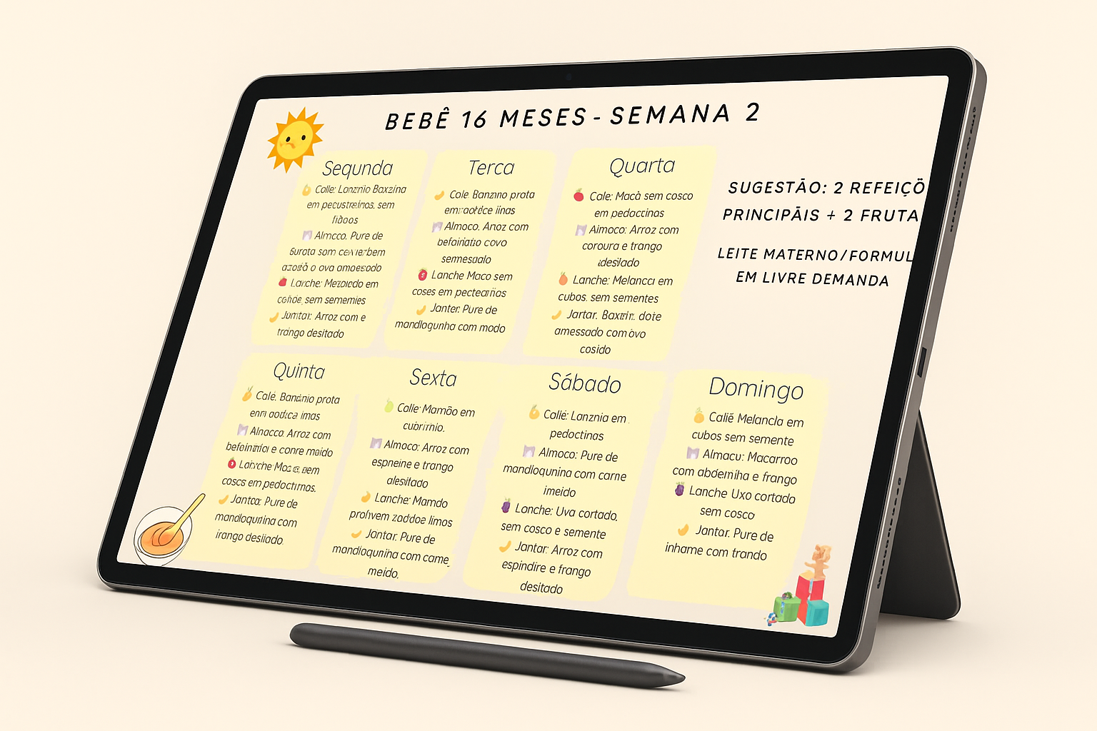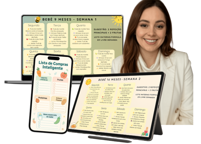 O Plano da Papinha te mostra exatamente o que oferecer em cada dia da semana, mês a mês, com uma organização visual que facilita sua rotina mesmo nos dias mais corridos