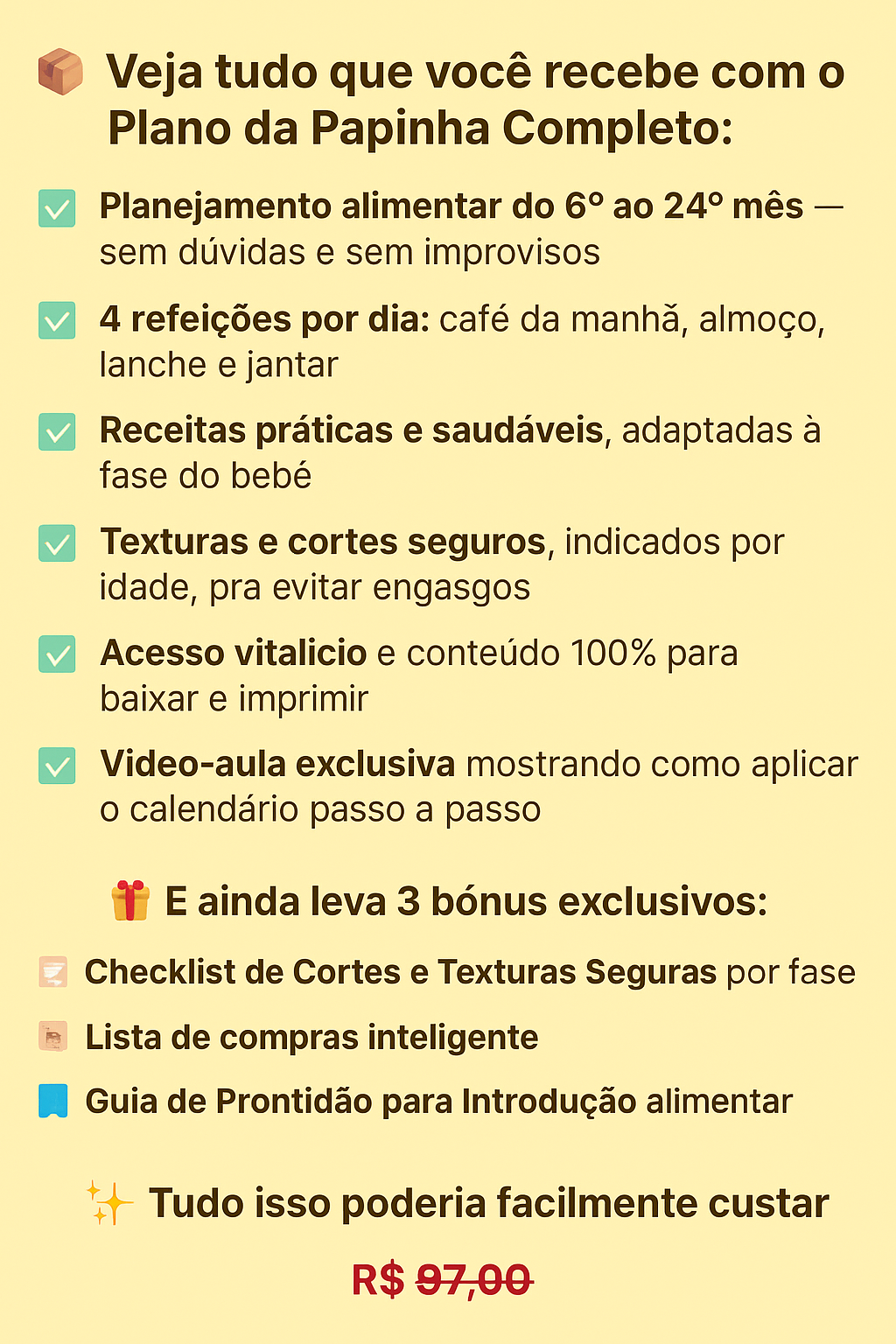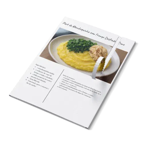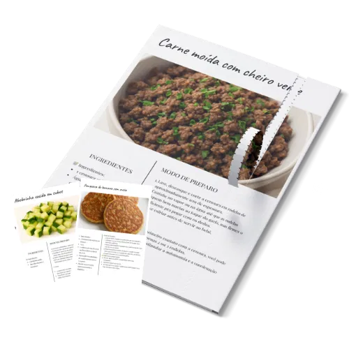 Além de + de 60 receitas com fotos e descrições, você também recebe orientações claras de como cortar e qual a textura ideal para o seu pequeno(a)